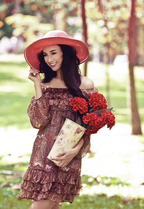 Hoa hậu Ngọc Diễm đẹp dịu dàng với váy họa tiết hoa điệu đà cùng
